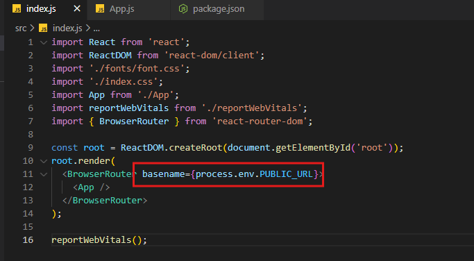 8. 만약 react-router-dom을 사용하고 있고 화면에 빈 화면만 나온다면 아래 코드를 수정하고 다시 npm run deploy 를 해보자
