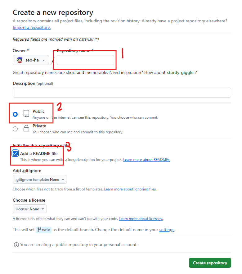 2. 나는 하위 파일을 만드는거라 그냥 파일 이름을 적었지만 그게 아니라면 파일이름.github.io를 적고 버튼들을 클릭하고 생성한다.