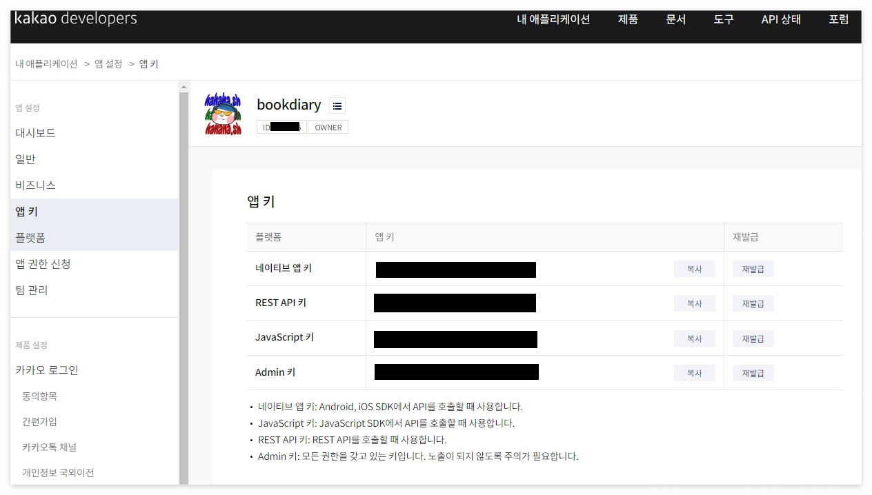Kakao API을 사용하기 위해서는 REST_API_KEY 를 알아야하는데 https://developers.kakao.com/ 에 로그인을 하고 내 어플리케이션을 등록한 후 앱키에 들어가면 정보를 알 수 있다.